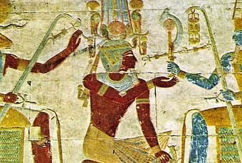 Bajorrelieve en el Templo funerario de Seti I (Abidos) que muestra, a la izquierda, al dios Jnum, representado con la cabeza de un carnero, dios creador y de la noche, en el centro el faraón Seti I, y a la derecha, el dios Amun.