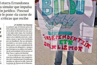La fotografía que la derechona extrema convirtió ayer en el centro de la campaña electoral con la que según ellos pretenden cambiar la vida de millones de parados ciertamente chirría. Igual que el disgusto que se han llevado algunos que quizá hubiesen tenido un orgasmo si en vez de ver al ex preso de ETA tras cumplir su condena con una pancarta promocionando un partido político, lo hubiesen visto simulando pegar tiros con una metralleta y pegando alaridos apelando al tiro en la nuca y la lucha armada. Lo mismo en ese caso era defendido por “El Mundo”: no sería la primera vez que lo hacen.