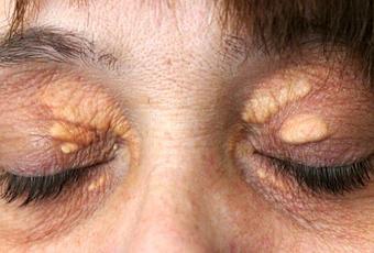 Estas placas amarillentas debajo de la piel suelen aparecer de forma simétrica en las esquinas internas de los párpados, por lo general afecta tanto a los párpados superiores como inferiores. Esta condición se conoce médicamente como xanthelasma palpebrarum (o xanthelasma) y por lo general afecta a las mujeres en sus 40 y 50 años. Los hombres y las personas más jóvenes también pueden verse afectados. A pesar de que no es perjudicial para la salud, puede ser estéticamente desagradable y que a veces puede causar la caída de los párpados superiores. Sin embargo, la vista o la función de los párpados no se ve afectada.