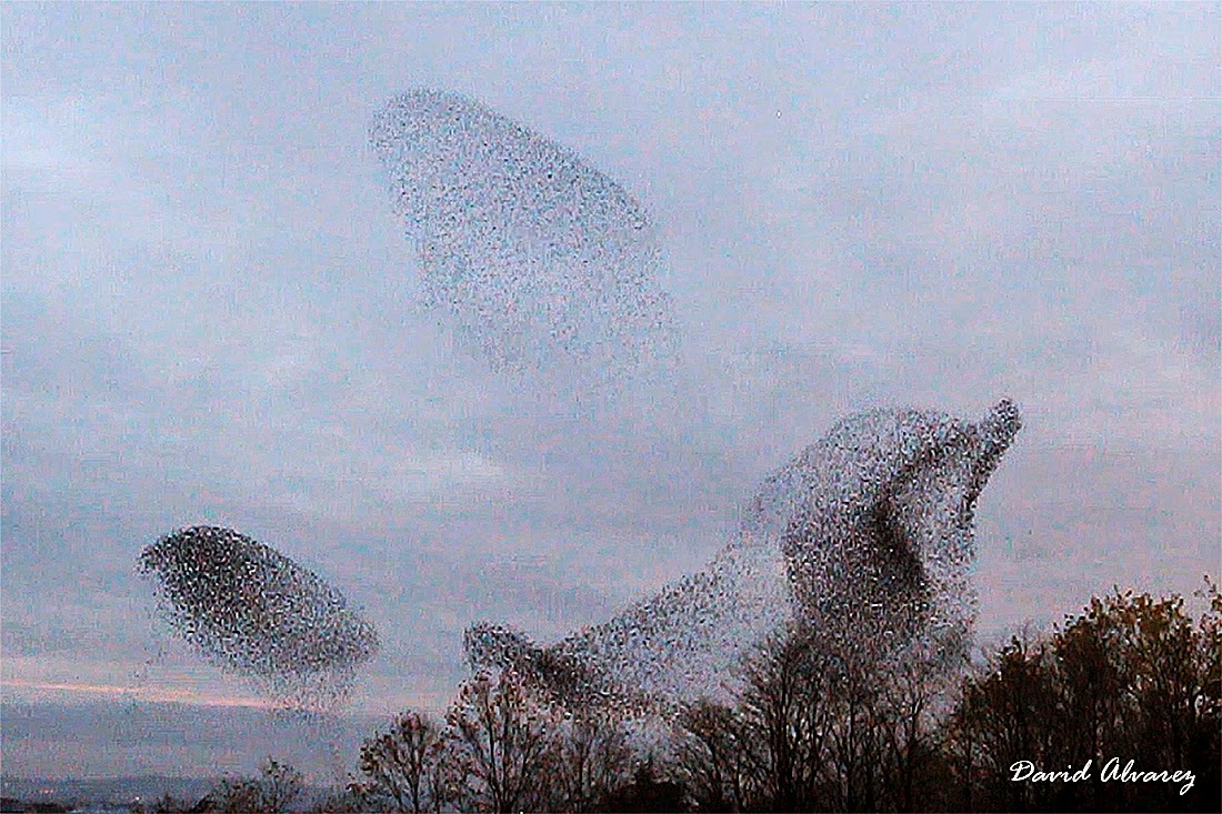 Normalmente, si vemos estas agrupaciones, como ocurre con los "bailes" de los estorninos poco antes de llegar al dormidero, no entenderemos muy bien lo que ocurre a no ser que nos fijemos en todos los detalles. En primera de las tres fotos anteriores se observa a un grupo de varios miles de estorninos llegando al dormidero. En este caso, la estructura del bando es dispersa y los estorninos permanecen relativamente separados unos de otros, por lo que sería relativamente sencillo fijar la atención sobre uno de ellos y atacarlo.