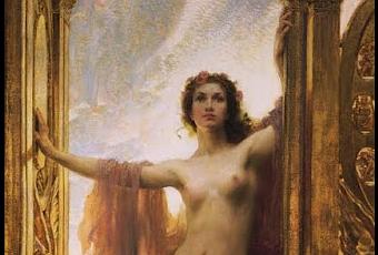 (Detalle del óleo La Puerta del Amanecer -El lucero del Alba-, 1900, del pintor prerrafaelita Herbert James Droper; Fotografía del telescopio de la NASA Spitzer, 2004, Pléyades, cúmulo abierto, imagen infrarroja; Óleo de Giorgione, La Tempestad, 1508, Galería de la Academia de Venecia, Italia; Imagen del Martín Pescador, Alcedo Atthis; Cuadro Alcíone, 1915, de Herbert James Draper.)