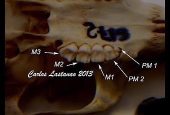 Esta es la última entrada dedicada a los dientes de los roedores. Queda por hablar en un primer lugar de la familia Sciuridae, y en ella de dos especies en la Península. Uno es la marmota Marmotta marmotta, (autócotona, extinguida y reintroducida hace unos 40 años) y otro la ardilla Sciurus vulgaris. La fórmula dentaria de los esciúridos es más completa que la de los arvicolinos o los múridos. El número de incisivos sigue siendo de uno tanto en el maxilar superior como en la mandíbula inferior, pero sigue existiendo un gran diastema entre esos y el grupo molar.(Se entiende que en cada lado).La muelas presentan crestas tuberculares en la cara lingual y crestas simples en la cara labial que se aprecian en la fotografía. Presentan también alguna cresta transversal desde los tubérculos linguales hacia la línea de crestas labiales.Tanto en el caso de la ardilla, (foto superior) como en el de la marmota, la fórmula dentaria es I 1/1; C 0/0; PM 2/1; M 3/3.No es posible confundir estas especies entre sí debido al mayor tamaño alcanzado por la marmota, cuyas series molares superior e inferior rondan los 20 mm. Esta medida se encuentra en torno a los 10mm. en el caso de la ardilla.