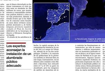 Recorte de las páginas centrales (8 y 9) del suplemento El Zoco de Diario Córdoba en su edición del domingo 12 de diciembre de 2010. Este artículo está dedicado al grave problema de la contaminación lumínica, mostrando datos de una investigación reciente liderada por el astrofísico Alejandro Sánchez de Miguel (UCM), quien tiene mucha información en su blog. La imagen muestra la Tierra de noche, imágenes de satélite mostrando la contaminación lumínica de nuestro planeta. En detalle, se muestra el mapa de España. Crédito de la imagen: NASA.