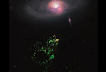Imagen del "Objeto de Hanny" (Hanny's Voorwerp) obtenida combinando varias tomas conseguidas con el Telescopio Espacial Hubble (HST): datos en infrarrojo en banda H (verde oscuro), en óptico en filtros I (rojo oscuro) y B (azul) y en las líneas de emisión de Hα (rojo) y [O III] (verde). Crédito: NASA, ESA, W. Keel (University of Alabama), and the Galaxy Zoo Team.
