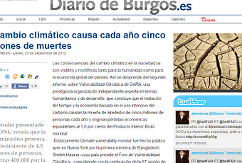 "(...) Así se desprende del segundo informe sobre Vulnerabilidad Climática de DARA, una prestigiosa organización independiente experta en temas humanitarios y de desarrollo, que concluye que el mutación del tiempo y la economía basada en el uso intensivo del carbono causan la muerte de alrededor de cinco millones de personas cada año y originan pérdidas económicas equivalentes al 1,6 por ciento del Producto Interior Bruto mundial..... Según el estudio, la climatología y la economía de uso intensivo del carbono causan cinco millones de muertes cada año, 400.000 debidas al hambre y las enfermedades transmisibles agravadas por la mutación del clima y 4,5 millones vinculadas con la contaminación atmosférica. LEER TODA LA NOTICIA EN DIARIO DE BURGOS