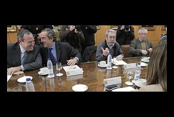 Según vemos en esta foto, los empresarios están contentos. Tan satisfechos de la reforma laboral rajoniana que ríen con ganas, a pesar de la circunspecta escena en la que se hallan: la reunión con la Ministra de Trabajo, en presencia de los "pálidos sindicatos". Y es que los empresarios no pueden dismular su gran alegría por haber conseguido, para la clase empresarial, la mejor reforma laboral que ha habido en todos estos años de democracia. Por ello ríen de satisfacción.