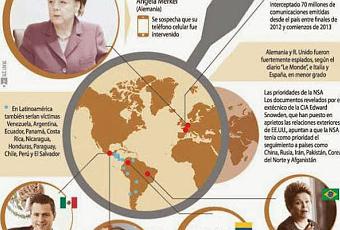 Al menos 35 líderes políticos mundiales habrían estado entre los objetivos. Se sospecha que el móvil de la canciller alemana Ángela Merkel fue pinchado, al igual que el correo personal del entonces presidente mexicano Felipe Calderón o las comunicaciones de su homóloga brasileña Dilma Rousseff.