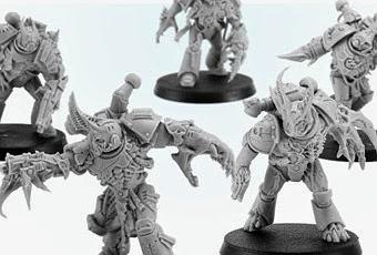 Los Gal Vorbak o "Hijos Bendecidos" en la lengua de Colchis(Planeta natal de los Portadores de la Palabra) ya estan en pre-pedidos.En los Index Astartes se decía que los Hijos de Horus fueron los primeros en tener marines poseídos por demonios,emulando a su Horus al que creían poseído también.Pero con las novelas de la Herejía de Horus y mas concretamente en El Primer Hereje(The First Heretic),de Aaron Dembski-Bowden(Muy recomendable,por cierto) ese honor recae en los Portadores de la Palabra y mas concretamente en los miembros del capítulo del Sol Serrado,que fueron los que se adentraron en el Ojo del Terror y tomaron Cadia para el Imperio(Una deliciosa ironía,seguro obra de Tzeentch).Fueron los primeros en llevar la armadura de color rojo en vez de gris de su Legión y fueron una terrible sorpresa para sus hermanos leales en Istvaan V.Su líder era Argel Tal,al que espero que le saquen una miniatura algún día.Están en pre-pedido y no salen a la venta en abierto hasta el 15 de agosto por 45 libras,que la cambio actual vienen a ser casi 57 euros.Muy caro,por 5 miniaturas de resina,aunque hay que reconocer que Steve Whitehead.Pese a tener servoarmadura,tiene peana de exterminador porque son bastante mas altos y robustos que una figura de marine.De hecho están realizados practicamente en "true-scale":