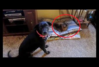 Realmente muy divertido el video y muy interesante las reacciones de ambos animales, uno tranquilo, el otro impaciente por recuperar su cama, pero que no hace el uso de la fuerza con que cuenta, sino que todo al revés, busca obtener lo que es suyo con pataletas o aptitudes sorprendentes.