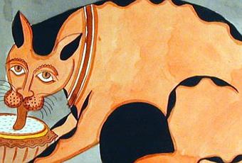 Lo sorprendente, al mirar los cuadros, es descubrir que el gato es el único animal que aparece retratado solo, sin el ser humano. Suele estar en la misma posición, sentado y mirando hacia la izquierda, a veces vestido, y siempre lleva un animal en la boca, en la mayoría de los casos una gamba de buen tamaño, a veces un ratón o un pájaro. No hemos encontrado nada que explique por qué se representaba al gato en solitario y no a otros animales. Algunos avanzan la teoría de que pertenece a las series de “pat” que describían escenas familiares; otros que el gato simboliza al hombre santo que no es capaz de abandonar del todo las tentaciones terrenales. Esta última nos parece una explicación muy simplista para una religión tan complicada como la hindú.