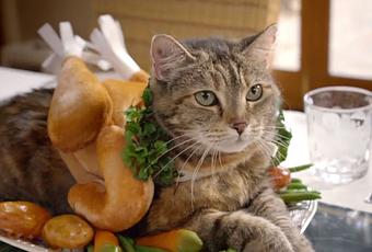 En el spot de Temptations, vemos algunos gatos un poco descolocados por las fantasías de sus propietarios, pues los disfrazan como Santa Claus, Elf, ¡y hasta de un jugoso pavo!