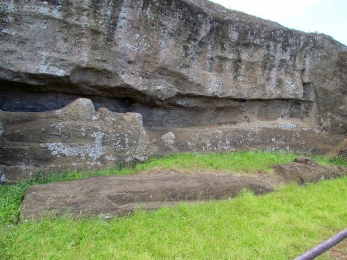 Los gigantes dormidos. Varios moai quedaron en las faldas del volcán en proceso de elaboración. Entre ellos está el gigante de 21 metros.