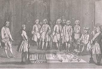 Cualidad: ¿Todos los presentes son Maestros Masones, a excepción del profano, tal y como muestran sus respectivos mandiles, que podemos que parecen estar «normalizado», pues todos llevan el mismo modelo o similar, salvo en el personaje 8 donde se aprecia claramente la baveta del mandil, ¿Significa algo esa diferencia? Por tanto, todos tienden a una cierta uniformidad a la hora de asistir a los trabajos. No sé si portan sus mejores galas, pero es evidente que van elegantemente vestidos a la ceremonia de recepción masónica que se desarrolla ante nosotros. En el grabado vemos que algunos de los Maestros portan espada, aunque no todos, ni aquellos que la portan, no siempre es apreciable su uso, pues no llevan la clásica banda de porta espada, aunque no es menos cierto que en otros gravados se ven los atalajes porta espada en sus diferentes modelos. Entre las figuras que llevan espada, están las figuras 1-7 y11 En cuanto al desarrollo de cargos que se pueden identificar en el grabado están: Figura 1.- Guarda Templo interno con espada en alto y presentada en la mano derecha y mostrada como tal hacia dicho lado, esta figura que muestra también a una persona joven se encuentra en muy segundo plano. Figura 2.- 2º Vigilante, lleva su joya colgada de una cinta y como tal su joya lo delata como dicho oficial. Él es el acompañante del recipiendario que de forma suave conduce a este hacia el borde del Tablero de logia. Este oficial lleva el mallete cilíndrico colgado de la cintura en la parte derecha, lo cual nos puede parecer extraño al no haber mesas para el ejercicio de los oficiales, aunque tal peculiaridad deviene del Maçon Demasqué, en el cual se indica que algunos oficiales como el 2º Vigilante, o el 1º Vigilante, que aquí no se aprecia van «Con los pequeños malletes que ellos tienen en la cintura». Figura 3.- Profano o recipiendario. Sera descrito más adelante. Figura 4.- 1º Vigilante, lo describimos como tal situarlo al pie de la columna «J», no parece que lleve malletes, pero entre la amplia bocamanga con puñetas y el candelabro, estos no dejan ver si porta el mallete también a la cintura. Figuras 5 y 6. Estos masones no hay nada que les identifique como cualidad a desarrollar, aunque su porte les haga destacar en el grupo central de asistentes a la ceremonia de recepción de un profano. Figura 7.- Tesorero, de su pecho cuelga una diminuta llave, y no parece que en dicho cuadro de personajes se encuentre su homónimo el hospitalario. Figura 8.- Orador, se le identifica en otros grabados por su insignia circular como el Orador, en los rituales franceses se le sitúa siempre a la izquierda del Venerable, aunque aquí parece ocupar el puesto de Capellán de la masonería anglosajona. Es al único al que se deja notar en su mandil la baveta. Figura 9.- Un masón eclesiástico, al cual algunos le otorgan la función de Orador, aunque en otros grabados aparece como el Orador el masón nº 8, mostrando una pequeña insignia redonda en su pecho Figura 10.- El Venerable Maestro, con sombreo en logia tal y como recoge el uso de los Modernos, con un tricornio, en otros grabados se le representa con un bicornio. Figura 11.- Es una figura que llama también la atención pues está al pie de uno de los candelabros que escuadra al modo de los Modernos, el tablero de logia y justo al lado del Secretario por lo cual cabe pensar ¿Quién es, y que función ocupa? Figura 12.- El Secretario, es junto con los Vigilantes y el Venerable Maestro, de los más reconocible por las dos plumas que cuelgan de su pecho. Pero cabe una duda ¿Sobre qué escribe…? Indicar una posición un tanto extraña, aunque igual composición y conducción del profano lo exige, y es que los dos vigilantes están situados al Suroeste. Se puede considerar que faltan oficiales dentro de una concepción más actual de los oficios en la logia, pero hay que tener en cuenta que en esos primigenios momentos no parecen contar con oficiales, como los Maestros de Ceremonias, el Hospitalario, el Gran Experto. Etc. Son concepciones aún muy simples en el desarrollo de las estructuras masónicas, de ahí que echemos a faltar algunas como las figuras como los diáconos. Por otro lado, se puede observar que todos a excepción del Venerable que dispone asiento y mesa, el resto está de pie y carece de mesa o pedestal para cumplir con las cualidades que hoy le prestamos a dicho oficiales, lo cual nos viene a indicar que las ceremonias eran muy simples y rápidas pasando luego a los trabajos de masticación. Vuelvo sobre la figura del Venerable, que va tocado con tricornio, en otros grabados se le muestra con un bicornio, en el Rito Moderno el Venerable Maestro va tocado con gorro de calle durante toda la tenida, en este caso el Venerable muestra el que se usaba de forma común como era el tricornio. Por otro lado lleva, como ya hemos comentado, lazo a modo de pajarita anudado al cuello, elemento que lo distingue, ya que además parece ser de color; en su mano derecha muestra un mallete, y sobre su pequeña mesa, a diferencia de otros grabados que se ven grandes mesas, aquí estamos ante una pequeña mesita sobre la cual, no hay espada alguna, salvo un libro que parece ser el ritual aunque muchos estudiosos vienen a incidir que es la biblia abierta por el evangelio de San Juan, tal y como expone el Perau (1700-1767) es muy posible que así sea en cuanto a las referencias textuales de los rituales, pero observando al Venerable y la disposición del libro y como este está situado, me inclino más bien a pensar que sean las anotaciones rituales para llevar de forma providente la ceremonia en curso. Otra cuestión es que, dado el desarrollo de la tenida, haya otro libro, en este caso la biblia, que se expondría delante del profano para realizar su juramento, pero por la percepción que nos sugiere el grabado no parece que el libro que esté bajo las manos del Venerable sea una biblia. De haber sido un libro con más represent