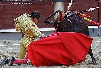 El que llamó hoy la atención, porque torear no toreó, fue Serafín Marín. Primero porque hizo el paseíllo con la senyera y la barretina, en acto de, se supone, proclama a favor de los toros en Catalunya. Parte del público protestó inicialmente, pues no entendían la reivindicación del Sera. También es posible, que al verlo con la barretina, creyeran que era otro regalo de Chopera al abonado en forma de forcado. Total, ayer salió el caballito, hoy forcados y mañana.., mañana Morante y juanpedros. Que es el ciclo normal de una feria de pueblo, que es lo que viene siendo esto que está pasando estos dias por Madrid. A él le tocó el único ibán potable de la tarde, el segundo, y no pasó nada. Muletazos hacia las afueras, siempre en linea recta, vaciando la embestida del toro cuanto más lejos mejor. Algunos, que se hacen la ropa jirones con el destoreo bonito, el del arte, el pellizco y no sé cuántas tonterías más, equivocadamente, vienen llamando a eso hondura, o largura en el peor de los casos. El destierro del toro de los terrenos del torero, con ese toque desplazador hacia fuera, es una de las trampas más abyectas y más usadas del toreo moderno. Afanoso y vulgar, a partes iguales, al sublevado catalán se le ha ido de las manos un triunfo que le hace falta como el comer. Porque de seguir así, se habrán acabado los toros para él, en su tierra y fuera, por lo menos como torero. Con el quinto, que casi no se tenía en pie, no se dió coba y aligeró el triste pesar de la tarde. Ahora, carretera, barretina, senyera y manta a otro lado. Lo que vale para De Mora, Picazo, De Justo y tantos otros vale también para él: en Madrid deben de estar los mejores.