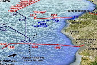 Barcelona,8.- Un periodista inglés, testigo del desarrollo de los acontecimientos más trascendentales del curso de la guerra en Euzkadi, acaba de publicar un libro titulado “El árbol de Guernica”, en el cual relata cómo en ocasión de volver con dirección a Bilbao, desde Bayona, el vapor correo del Gobierno vasco “Galdames", custodiado por los bous “Navarra”, “Guipúzcoa”, Vizcaya” y “Donostia”, se encontraron con el buque faccioso “Canarias”.