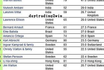 Aqui os pongo la lista de los 50 hombres mas ricos del mundo en el 2010 publicada por Forbes ,la mayoria son americanos ,solo destacar el español Amancio Ortega(dueño del imperio Inditex ) en el lugar 9º . Hay gente muy conocida como Carlos Slim (dueño de Telmex),Bill Gates (dueño de Microsoft),Warren Buffet,Lakshim Mittal(dueño de Mittal Sttel) ,Liliane Bettencourt (dueña del imperio Loreal),Michael Bloomberg( dueño de la cadena Bloomberg),Sergey Brin y Larry Page (fundadores de Google) ,George Soros ,Michael Dell (dueño de Dell) ,Roman Abramovich (presidente del Chelsea) .un saludo