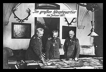 Se llama “Imperios Centrales” a uno de los dos grupos de países que combatió en la I Guerra Mundial. Los principales países de esa coalición fueron el Imperio Alemán, el Imperio Austro-Húngaro, el Imperio otomano (la actual Turquía) y Bulgaria (desde 1915). En la fotografía (tomada en enero de 1917), puedes ver al mariscal Paul von Hindenburg (izquierda) y al general Erich Ludendorff (derecha), los principales jefes militares alemanes durante la guerra; el personaje del centro es el emperador de Alemania: Guillermo II.