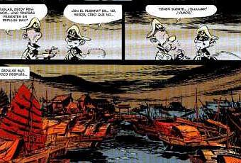 “El Cráneo del Padre Ze” continúa la historia inconclusa en “Aventura en Amarillo” para trasladar la acción a Macao, desde donde los protagonistas tratan de volver a Hong Kong una vez conjurada la amenaza comunista de invadir la colonia. Además de algunos personajes presentados ya en el álbum anterior y que prosiguen tejiendo su intriga alrededor de un enigmático cargamento robado, el trío protagonista se verá ahora enredado en las mentiras y peleas entre un jesuita y una pirata que tratan de hacerse con el valioso cráneo de un ejemplar del Hombre de Pekín por el que pujan los principales museos del mundo. Es un álbum con una dirección menos clara que los anteriores y con un dibujo insatisfactorio. Conrad se diría que ha finalizado su trabajo de forma apresurada: los fondos están descuidados y las figuras poco acabadas. Incluso el color es apagado y aburrido. Es posible que la serie remontara en las siguientes entregas, pero al no estar publicadas en España, han quedado fuera de mi alcance.