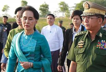 El jefe de las Fuerzas Armadas de Birmania, Min AungHlaing, y la jefa del Gobierno, Aung San Suu Kyi.