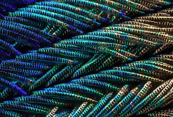 En esta serie de fotografías que ofrecen los delicados detalles de plumas de pavo real, el fotógrafo Waldo Nell se basó en un microscopio Olympus BX 53 para tomar cientos de imágenes individuales que se combinaron para crear cada imagen que se ve aquí.