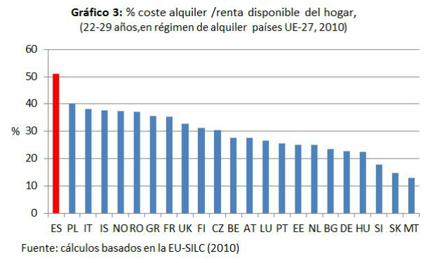 Los jóvenes españoles (de 22 a 29 años) dedican más el 50% de la renta a pagar el alquiler, según la última ola del panel de hogares de la ue (la eu-silc) del 2010.