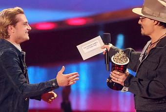 Instantánea de la entrega, donde Hutcherson recoge el trofeo entregado por Depp