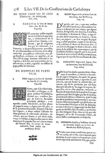 Siguiendo un orden cronológico, se pone de manifiesto como en las Cortes del año 1413 con D. Fernando I se aprueba que se debe redactar el texto en catalán entre otras razones para que “sea comprendido tanto por los letrados como por los no letrados”, los Usatges, las Constitucions y las Capítulos de Cortes, que seguirían la clasificación del Código de Justiniano.
