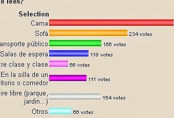 Sabía que la encuesta de junio iba a tener un claro vencedor: leer en la cama, con la espalda apoyada en la almohada, la manta por encima en invierno, una simple sábana en verano, en ese momento del día en el que podemos permitirnos no agobiarnos y nadie nos molesta, es una de las mejores sensaciones que puede experimentar un lector. Para mucha gente, leer va asociado a ese ratito de tranquilidad, incluso se considera una actividad agradable para relajarse antes de dormir (siempre que no se opte por un page-turner de terror, claro). Las otras opciones que voté yo fueron el sofá, las salas de espera y otros (porque, por muy cutre que suene, a veces me gusta leer sentada en el suelo). Antes también leía en el transporte público, pero últimamente he perdido ese hábito; el reproductor de música ha ganado esta pequeña batalla a los libros. Por otra parte, me dais mucha envidia los que leéis al aire libre, aunque, si me paro a pensarlo, las veces que lo he puesto en práctica he estado más bien incómoda (que si aquí me toca demasiado el sol, que si ahora me molesta la sombra, que si no sé cómo ponerme); en cualquier caso, la idea de leer en una zona verde bajo el cielo azul sigue siendo muy idílica. Por lo demás, me cuesta mucho ponerme a leer literatura sentada a la mesa; tantos años de estudiante me hacen relacionar el escritorio con el estudio, el trabajo, la obligación, y cuando leo por mi cuenta prefiero alejarme de este rincón. Para terminar, me parece muy significativo que las opciones alternativas a la cama hayan recogido un número importante de votos; esto demuestra que somos personas que leemos mucho, que dedicamos horas de nuestro día a día a la lectura —no solo ese tiempo residual previo a dormirnos. Una vez más, los blogueros subimos con creces la media.