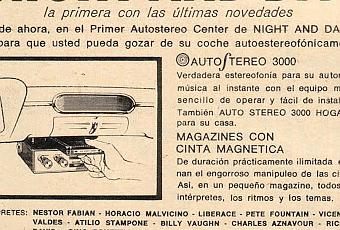 Tanto que anunciaba el primer centro, Night and Day, de magazines de Buenos Aires con todas las novedades del mercado local. Pero además de anunciar eso se publicitaba la venta del Auto Stereo 3000, un reproductor de magazine para el automóvil.