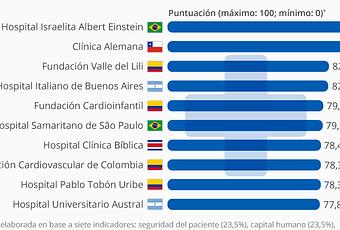 Desde 1950, la Organización Mundial de la Salud (OMS) conmemora el 7 de abril el Día Mundial de la Salud. Cada año, la organización elige un tema de salud diferente con el propósito de sensibilizar a la población en torno a un área considerada prioritaria. Este año le toca el turno a la cobertura sanitaria universal y de calidad. A propósito de esta conmemoración, y gracias a datos de América Economía, en Statista hemos querido mostrar cuáles son los centros hospitalarios que ofrecen un mejor servicio en la región de América Latina. Como muestra la siguiente infografía, el Hospital Israelita Albert Einstein, localizado en la ciudad brasileña de São Paulo, se llevó el primer puesto en calidad hospitalaria en 2018, con una puntuación de 98,75 sobre 100 posibles. En segundo lugar, con 92,57 puntos se encuentra la Clínica Alemana en Santiago de Chile, seguido de Fundación Valle del Lili en Colombia con 82,51 puntos. El análisis de la publicación se realizó a través de una encuesta en la que participaron 200 centros hospitalarios de la región. En el estudio se evaluaron distintos factores como la eficiencia, la dignidad, la experiencia del paciente, la gestión del conocimiento, entre otros. Fuente: N.com