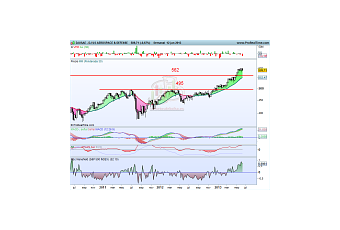 Algo parecido ocurre con el sector autoparts que tras haber marcado su máximo histórico en 305 puntos a mediados del 2011, el precio estuvo jugando con la mm de 30 sesiones hasta que hace algo más de un mes consiguió atravesarlo dándole paso a terreno todavía sin explorar. Tras la ruptura el precio realizó un pequeño acercamiento a la resistencia que ahora hace las veces de soporte en forma de pullback.