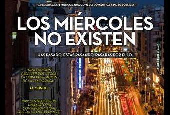LOS MIÉRCOLES NO EXISTENEstreno 5ª temporadaSábado 12 de septiembre , 23hTeatro FígaroViernes 22h, Sábados 23h y Domingos 20h Con más de 90. 000 espectadores “Los Miércoles no existen” estrenan su 5º Temporada consiguiendo ser una de las obras más longevas y de más éxito de la cartelera teatral española. Una dramedia romántica sobre las relaciones de amor y amistad que han conseguido crear un retrato generacional que ha sorprendido y enamorado a casi 1000.000 personas. Una hazaña de la que pocas funciones pueden hacer gala… Más de tres años en cartel con entradas agotadas, una gira con un éxito arrollador y cinco temporadas. Los miércoles es una mirada cercana a las relaciones modernas. Un retrato generacional urbano, en el que los personajes comparten con el público instantes íntimos y personales por los que todos hemos pasado, estamos pasando o pasaremos en algún momento. Una historia sobre las decisiones que nos toca tomar y que a veces aunque parecen muy inocuas pueden cambiarnos la vida.Un puzle de momentos y situaciones en torno a la vida de 6 personas, hombres y mujeres entre los 30 y los 40, a punto de romper con su rutina emocional y sentimental. Sin protagonistas ni secundarios. Vidas conectadas o que se rozan, contadas de manera aleatoria, fragmentada. EL ELENCOSi a una buena historia, le sumamos unos buenos actores, engrandeces el proyecto. Esto ocurre con los intérpretes de Los miércoles no existen…Daniel Guzmán, Javier Rey, Mónica Regueiro, Barbara Grandío, Marta Solaz, Irene Anula, Eva Ugarte, Javier Albalá, Iñaki Ardanaz, Alicia Rubio y Nacho López CON MÚSICA EN DIRECTO a cargo de Ester Rodríguez y Alberto Matesanz.Espectaculares, realistas, divertidos y con una química para trabajar en equipo que hace que cada función tenga una chispa diferente e inolvidable para el público que repite sin importarle porque cada función de Los miércoles no existen es UNICA. Además cuentan con la suerte de tener entre ese estupendo elenco a Javier Rey, conocido gracias a sus trabajos televisivos pero que actualmente está inmerso en su papel de Mateo en “Velvet” y en la nueva película de Paco León “Kiki” y con Daniel Guzmán, que además de un estupendo actor este mismo año nos ha impresionado a todos con su primera película “A cambio de nada”LA PRODUCTORA – PRODUCCIONES [OFF]Esta joven productora surge en medio de la crisis con el objetivo de llevar a cabo una forma alternativa de producción. Ofrecer soluciones en materia de gestión y producción a los colectivos que lo requieran, asesoramiento profesional a aquellas compañías que se están abriendo camino a través del tejido cultural, o la creación de proyectos propios con el objetivo de fomentar y dinamizar espacios alternativos de exhibición. Está claro que el trabajo bien hecho sale recompensado porque sus proyectos se han convertido en éxitos de crítica y taquilla como “RECORTES” versión de Juan Cavestany protagonizada por Alberto San Juan y Daniel Guzmán bajo la batuda del cineasta Mariano Barroso, “FEELGOOD” coproducción con el Teatro Español protagonizada por Manuela Velasco y Fran Perea, o su última inmersión dentro del mundo audiovisual con la producción del film “LLUEVEN VACAS” protagonizada por Maribel Verdú, Eduardo Noriega, Laia Marull, Asier Extexeandía ó Sergio Peris Mencheta entre otros.DIRECTORESMAITE PÉREZ ASTORGAActriz, directora y dramaturga de varios montajes entre los que destacan “La tempestad” de Shakespeare y “Salomé” de Oscar Wilde, este último programado en la sala Tis. Dirige y escribe “Sahara”, obra encargada por el Fisahara y programada en Microteatro y en La Cárcel (Segovia). Codirige los montajes “Quién teme a Virginia Wolf” y la obra de creación colectiva “La generación perdida”, coordinados por Marcelo Díaz y programados en La Cuarta Pared. En 2013 compagina la co-dirección de “Los miércoles no existen” con la ayudantía de dirección en “Que no he muerto”, obra del director y productor José Sámano. Compagina la escritura de guiones audiovisuales en productoras tan destacadas como Disney con las ayudantías en productoras como BARCO PIRATA (compañía capitaneada por Peris-Mencheta) ó ejerciendo de mano derecha de Daniel Veronese, director de escena aclamado a nivel internacional. PERIS ROMANOEn 2003 debuta tras la cámara con “Sigue soñando”, su primer cortometraje producido por Boca a Boca. A este primero, le siguieron otros títulos de mucho éxito que acumulan más de 200 secciones oficiales y una treintena de premios en festivales de todo el mundo. En 2004 da el salto a la televisión como director de la serie diaria “La Sopa Boba”, pasando por otras como “Yo soy Bea”, “Impares” o “Complices”. En 2008 se estrena en el largometraje con la película “8 Citas”, que llevó a las salas a 160.000 espectadores. Participó en la sección oficial del Festival de Málaga y ganó el premio a mejor director Novel en el Festival Internacional de Cine de Peñiscola. Los miércoles no existen, aunque fue concebida inicialmente como guión cinematográfico, ha sido su primera incursión teatral y un gran éxito desde sus estreno en 2013. FICHAGÉNERO: Dramedia romántica DURACIÓN: 1h 45m aprox. AUDIENCIA: No recomendada a menores de 13 años DIRECCIÓN: Maite Pérez Astorga, Peris Romano TEXTO: Peris Romano INTÉRPRETES: Daniel Guzmán, Javier Rey,Mónica Regueiro, Barbara Grandío, Marta Solaz, Irene Anula, Eva Ugarte, Javier Albalá, Iñaki Ardanaz, Alicia Rubio y Nacho LópezMÚSICOS: Ester Rodríguez, Alberto Matesanz ESCENOGRAFÍA & VESTUARIO: Almudena L. Villalba DISEÑO ILUMINACIÓN: Sergio Guivernau COREÓGRAFO: Zoe Sepúlveda FOTOGRAFÍA: Natxo López, Juanma Kostavesky, Carlos Ruíz DISEÑO GRÁFICO: Jorge Espejo, Alberto Matesanz PRODUCCIÓN: Producciones[off] DISTRIBUCIÓN: Traspasos Kultur ¡Atrévete a vivir la experiencia!“Una obra que con