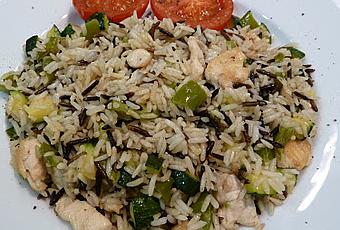 Cuando se consuma toda el agua prueba de cocción, te quedará un poco al dente. Si está a punto añade el pollo y las verduras y saltea todo a punto de servir.