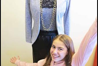 Este modelito lleva: una americana gris, que le da ese toque elegante, una camiseta gris con un poco de encaje negro de flores en la parte superior que le da un toque moderno, una falda negra de cuero y un collar de cadenas dorado, que le dan esos toques modernos pero elegantes.