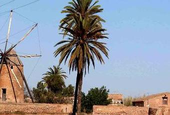 Molino, palmera y cables. Parecen tres elementos inseparables. La palmera recuerda la sequedad del territorio, el molino cómo se vencía y los cables son los testigos de como las bombas eléctricas han sustituido el rugido de los engranajes.