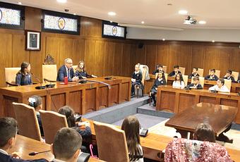 Dentro del programa de visitas de colegios al Consistorio, el Ayuntamiento de Ponferrada recibió hoy a 37 alumnas y alumnos de 10 años de edad, de 5º Curso de Educación Primaria, del colegio Espíritu Santo, acompañados de las profesoras Maribel Arias y Leticia Herranz. En el Salón de Sesiones fueron recibidos por alcalde y en ese mismo escenario se celebró a continuación un Pleno Infantil en cuyo turno de ruegos y preguntas las niñas y niños plantearon al alcalde preguntas, peticiones y aportaciones para mejorar la ciudad.