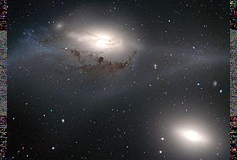 Lo que tenemos aquí son dos galaxias que se encuentran a unos 50 millones de años luz de nosotros y entre ellas las separa una distancia de 100000 años luz, distancias que una vez más nos ponen de manifiesto lo grande e inmenso que es el Universo. Si miramos con detalle la imagen veremos que las galaxias no son idénticas. La de la derecha parece compacta y está desprovista de gas y polvo, en cambio, en la de la izquierda es fácil apreciar delante de ella nubes de polvo. Cómo llegaron a esta configuración es algo que no se sabe seguro pero los astrónomos piensan que es debido a un acercamiento entre las dos galaxias que tuvo lugar hace unos 100 millones de años. Al acercarse, las ambas galaxias se vieron sometidas al tirón gravitatorio de la otra galaxia. Mientras que a la galaxia de la izquierda ese tirón gravitatorio la deformo y despojo de parte de su material, a la otra galaxia el tirón gravitatorio la arrancó por completo el gas y el polvo que contenía dejando esa especie de núcleo de galaxia desnudo. ¿Queréis mirar al cosmos a los ojos? Aquí los tenéis:
