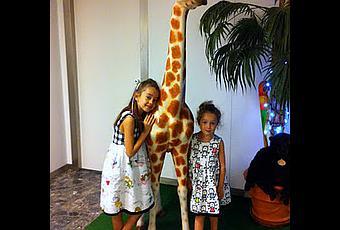 Esther y Ana con la jirafa al lado de un oso y un loro