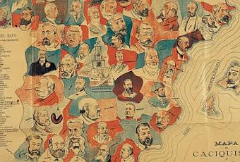 Mapa del caciquismo español publicado por el periódico satírico Gedeón S. XIX.“Setenta y dos familias de caciques –escribía hace dos años PabloHeraklio en diario unidad/nodo50–, están arruinando a España por comunidades”. Un artículo que, pese al tiempo pasado, no ha perdido ni pizca su vigencia. “El poder en España –decía– se mueve en círculos, esferas, parcelas, divididas y repartidas gracias a años de pugnas y cuchilladas, y arraigadas gracias a casi 70 años de franquismo, 35 años de dictadura militar y 33 de dictadura parlamentaria. Busca y comprueba quien es el sátrapa que te está oprimiendo. Los caciques tienen una función esencial en la dictadura democrática: son los encargados de organizar a los compromisarios, consiguiendo el número de votos estimado por el partido político de turno. Hay muchas formas de llevarlo a cabo, desde organizar fiestas populares, montar periódicos o proporcionar trabajo a cambio de afiliación, tarea que se lleva realizando desde el primer sufragio. A cambio, se benefician de la concesión pública, repartiendo el dinero de las comisiones”. En ese artículo se pretendía mostrar a las familias de caciques que se habían adueñado del territorio físico, de modo que su palabra era ley, controlando ayuntamientos, jueces, comisarios, cajas, y periódicos. Pretendían el mismo poder que barones o marqueses y no necesitaban presentarse a las elecciones para que la corporación municipal hiciera lo que ellos ordenaban. “Por eso mismo –terminaba diciendo– quedan excluidas las familias que se mueven en la gran Banca o grandes obras, como las 15 familias que controlan el Ibex 35, vencedoras absolutas y cuyo poder se extiende por todo el territorio e incluso en el extranjero, como es el caso del Banco Santander, merecedoras de un artículo a parte”.