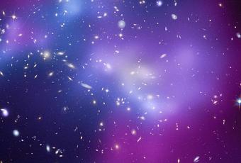 Esta imagen compuesta muestra el enorme cúmulo de galaxias MACSJ0717, donde cuatro grupos de galaxias separadas han estado involucrados en una colisión, ésta es la primera vez que un fenómeno parecido se ha documentado. El gas caliente se muestra en una imagen del Observatorio de rayos X Chandra y las galaxias se muestran en una imagen óptica del telescopio espacial Hubble. El gas caliente es un código de colores que muestra la temperatura, similar a un mapa de temperaturas de la Tierra descritos en la predicción del tiempo. En MACSJ0717 se muestra el gas más frío en color púrpura rojizo, el gas más caliente se muestra en color azul y las temperaturas medias son de color púrpura. Las repetidas colisiones en MACSJ0717 sucedieron hace 13 millones de años luz, el gas y la materia oscura, vista como un filamento, se vierte en una región completamente llena de materia. Una colisión del gas entre dos o más grupos de galaxias, hace que el gas caliente reduzca la velocidad. Sin embargo las galaxias compuestas principalmente de espacio vacío, no reducen tanto la velocidad del gas caliente, por lo que se mueven por delante del gas. Por tanto, la velocidad y la dirección del movimiento de cada grupo, perpendicular a la línea de visión, se pueden estimar mediante el estudio del desplazamiento entre la posición media de las galaxias y el pico en el gas caliente.