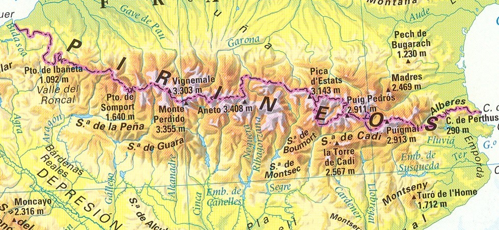 Los PIRINEOS, una cordillera joven típicamente alpina, se extienden a lo largo de 435 Km entre el Golfo de Vizcaya y el cabo de Creus. La línea de cumbres sirve de frontera entre España y Francia. La vertiente española tiene una gran anchura, llegando a superar los 100 Km de norte a sur en el sector central.