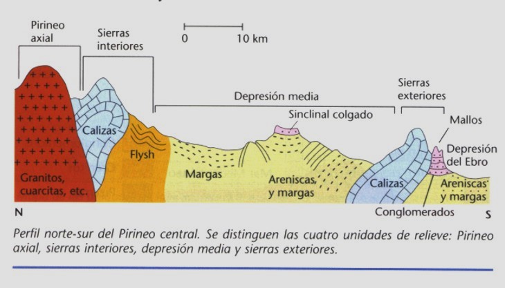 Sierras interiores y Sierras Exteriores se formaron en la Era Terciaria por el plegamiento de materiales secundarios (fundamentalmente calizas) depositados en la fosa pirenaica. Relieves menos altos que en la zona axial.