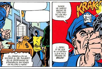 Disculpad que no ponga las viñetas originales.Esto es uno de los primeros guiones de R. Thomas así que podemos estar seguros de que no es humor negro o ironía... Me imagino al poli... Un señoro tradicional, buen vecino, amante esposo-padre, honrado, patriota; y como todos los dese tipo, un puto peligro para los demás. Sólo podría disculparle el que fuese rolero. Porque esa actitud soberbia y agresiva es del típico danyonero que no ve seres con derechos sino px que canjear por más poder. En fin. No tengo ni puta idea de a qué menfrento pero disparar en un lugar cerrado lleno de gente jamás ha puesto en peligro a nadie. No voy a provocar pánico por disparar sin avisar; donde pongo el ojo pongo la bala; me superan en nº pero yo disparo 1º; además voy a disparar a matar aunquestos delincuentes no hayan hecho daño a nadie. Debe ser super angustiante estar en medio de un fregado y ver llegar a la poli estadounidense. Normal que en EEUU haya superhéroes. La poli dallí es el peor remedio posible.