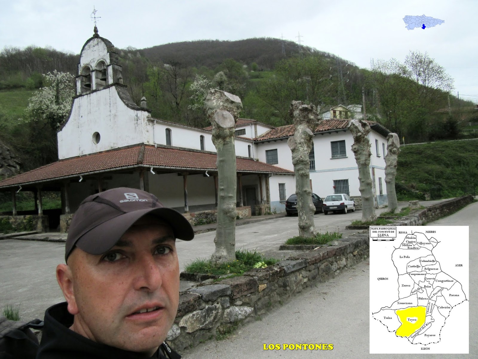 Domingo, 22 de abril de 2018. Estamos en la localidad de LOS PONTONES (600 m), en el concejo de L.lena, dejando aparcado el coche en la plaza de la iglesia. Este poblado, situado en la confluencia de los arroyos que descienden de Tuiza por Teyeo y de Foz por Traslacruz, debe el nombre a su condición de lugar de paso sobre unos pontones tendidos sobre las aguas del río Güerna. Había dos pontones principales de madera (ahora de cemento) y un tercer pontón secundario más estrecho