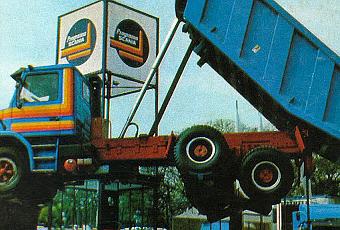 Tal vez era lo más impactante del stand armado por la empresa sueca radicada en la provincia de Tucumán. Ese camión volcador Scania T112 E 6x4 suspendido en dos gruesas torres de hierro de unos 5 metros de altura. El stand de Saab Scania Argentina estaba a escasos metros de la entrada tradicional sobre la Avenida Santa Fe, frente a la Plaza Italia. Así que no había manera de no ver a ese camión volcador suspendido en el aire.