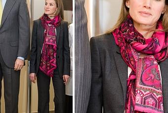 Los Príncipes de Asturias visitaron ayer la fábrica de Nestlé en Girona. Dña. Letizia eligió para la ocasión un traje de chaqueta de dos botones y pantalón en tono gris azulado ,de estilo masculino, que le hemos visto otras veces y que combinó con una blusa blanca de cuello redondo y botones y zapatos cerrados de tacón bajo de ante a juego. Como complemento la Princesa lució una favorecedora pashmina estampada en tonos fucsia que le favorecía mucho y animó el conjunto.La esposa de D. Felipe llevaba su melena suelta con la raya más ladeada y sus pendientes favoritos, unos diamantes en forma de estrella.