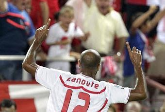 Si por algo destaca Kanouté es por ser un jugador de pocos toques y juego directo. Funciona como un velocista que no se complica. Así, con dos zarpazos, uno preciso con la pierna y un cabezazo a centro de Navas –el único campeón con España presente en el partido– desnortó a un Barça, fiel a su ideario e impulsado por sus jóvenes, por la hiperactividad de Dos Santos, el desparpajo de Oriol Romeu o la seguridad del portero Miño, titular por la no convocatoria de Valdés y sobre todo por la lesión de Pinto. El guardameta del filial tuvo poco trabajo en la primera parte: tan sólo tuvo que emplearse ante un tiro de Navas y salvó como buenamente pudo la cesión de Sergio Gómez, otro pipiolo, tan seguro en el corte como cortado ante el agobio de los delanteros rivales. A sí respondió a la presión de Luis Fabiano.