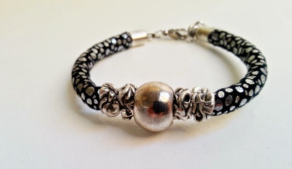 Pulsera de cuero con jaspeado plateado. piezas centrales de metal de zamak, cierre de mosquetón y cadena plateada ajustable a distintas muñecasDe venta en ETSY ClicandoAquíPrecio 18 €
