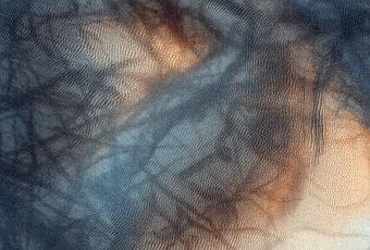 Notable imagen tomada el 29 de marzo de 2011 por la cámara HiRISE a bordo de Mars Reconnaissance Orbiter en donde podemos ver multitud de trazas de remolinos de viento y polvo llamados dust devils, un fenómeno muy habitual en la superficie marciana. Las trazas de numerosos remolinos dibujan intrincadas formas en las dunas levantando la capa superficial y revelando una capa inferior más oscura. Clic para ampliar.