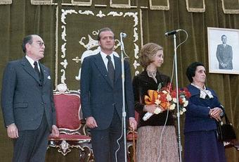 Para la recepción de SS. MM. Se colocó en la Plaza del Llano, el estrado en el que se corona a las Romeras Mayor e Infantil de nuestra Romería y que fue ubicado en el sitio de costumbre, en la fotografía apreciamos los Reyes junto al Sr. Alcalde D. Jesús Pérez Pueyo y su esposa, los cortinajes verdes y el repostero central del antiguo estrado (se utilizó hasta 1993 en que se realizó el actual), había sido estrenado solo un año antes, en 1975, año en que fue Romera Mayor la señorita Pastora Hortelano García y Romera infantil la niña Nati Rosa Sanz Sanz.